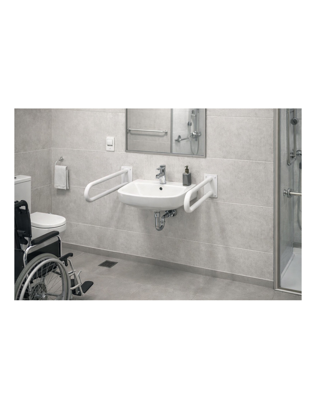 Dzięki solidnej konstrukcji uchwyt zapewnia stabilność podczas korzystania z umywalki, wstawania czy utrzymywania równowagi. Może być stosowany zarówno w domowych łazienkach, jak i w placówkach opiekuńczych, rehabilitacyjnych czy medycznych.