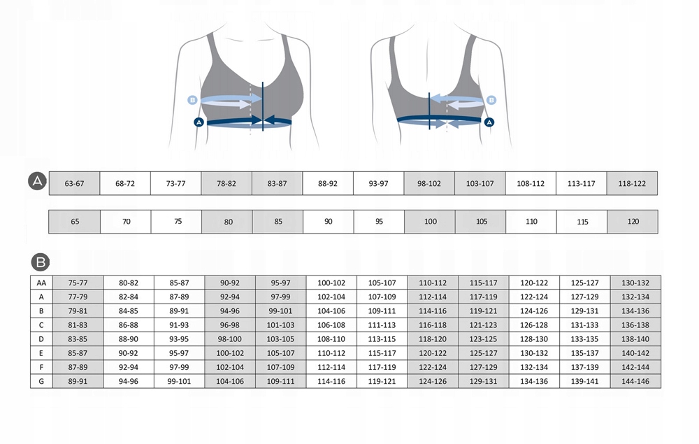 - Obwód pod biustem (A): Zmierz obwód klatki piersiowej pod biustem (np.86), ważne aby podczas pomiaru mieć na sobie biustonosz, a taśma miernicza była na tej samej wysokości z przodu i z tyłu.
