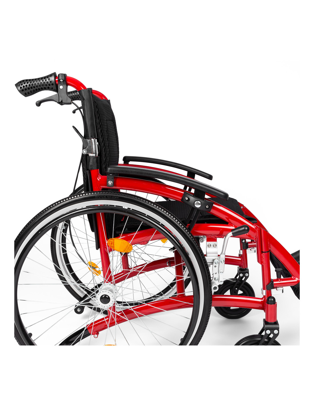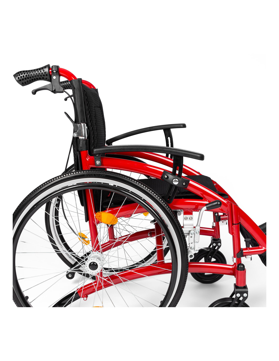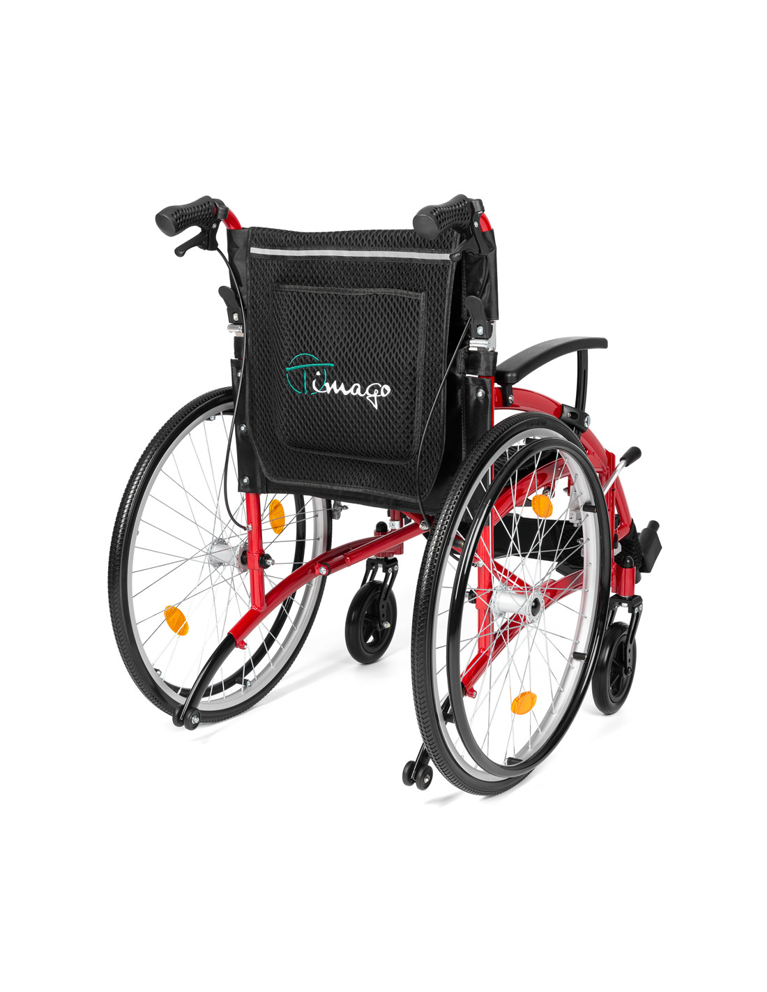 - BEZPIECZEŃSTWO - Wózek został wyposażony w kółka antywywrotne co sprawia, że jest bardzo zwrotny i zapewnia maksimum bezpieczeństwa użytkownikowi. Dodatkowo zamontowano na nim odblaski na oparciu i kołach co sprawia, że użytkownik jest widoczny nawet po zmroku.