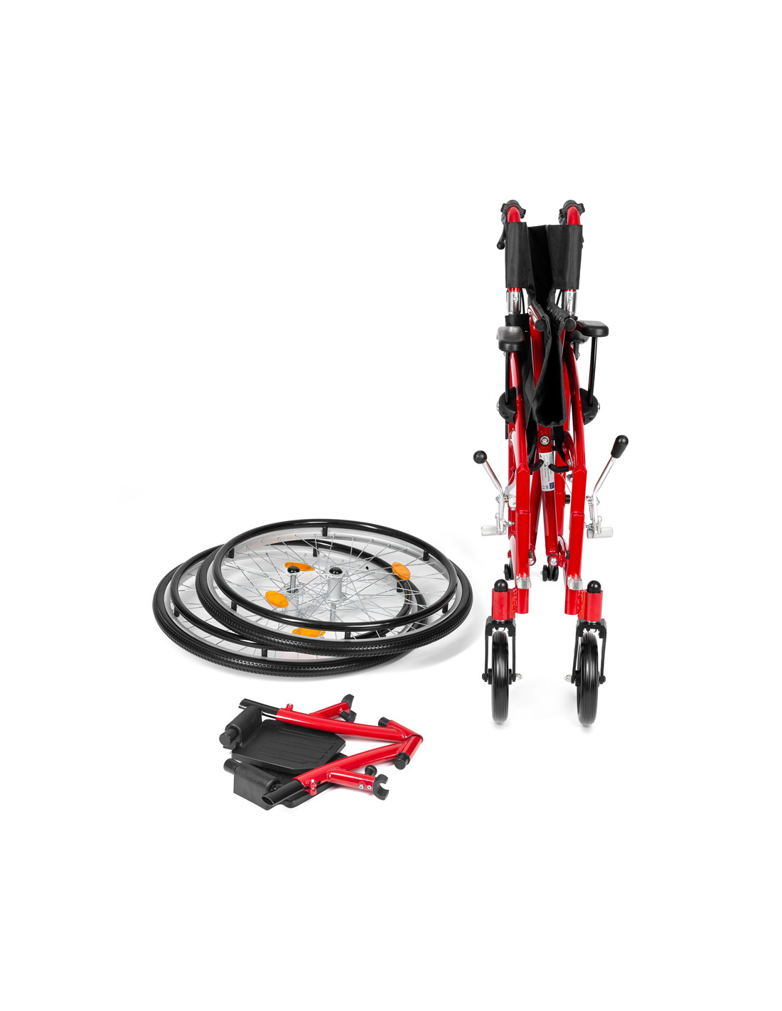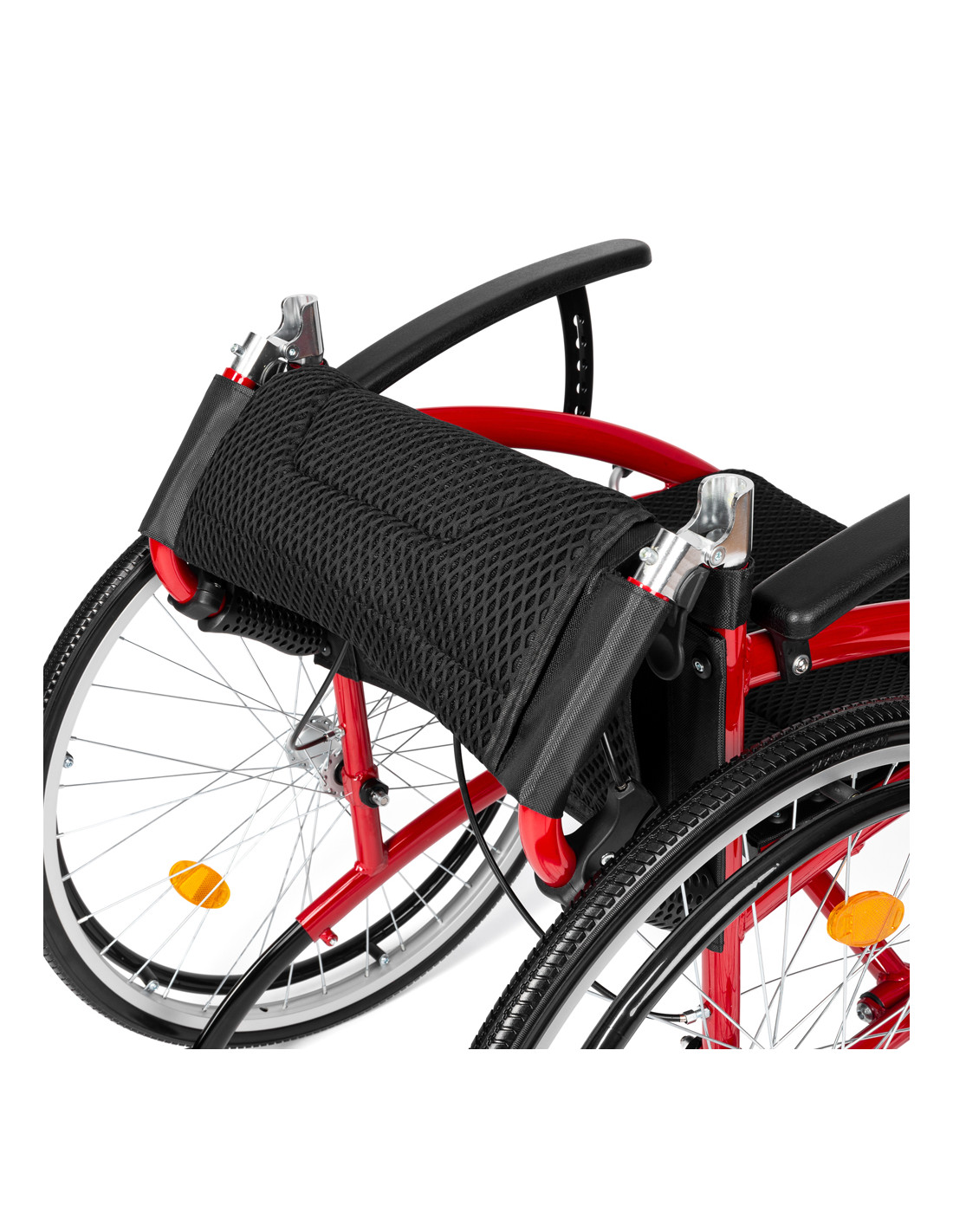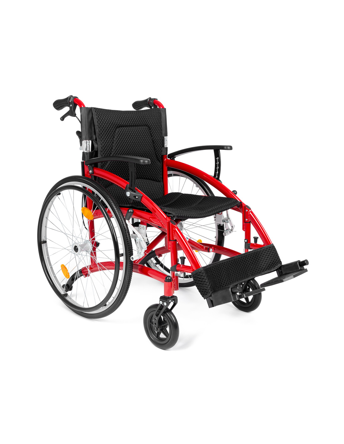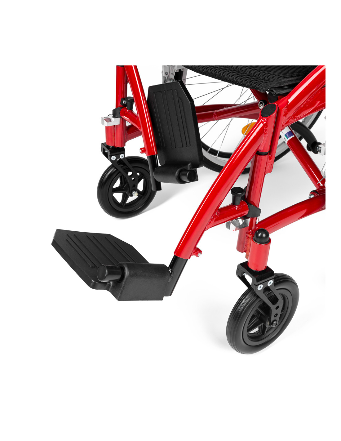 - BEZPIECZEŃSTWO - Wózek został wyposażony w kółka antywywrotne co sprawia, że jest bardzo zwrotny i zapewnia maksimum bezpieczeństwa użytkownikowi. Dodatkowo zamontowano na nim odblaski na oparciu i kołach co sprawia, że użytkownik jest widoczny nawet po zmroku.