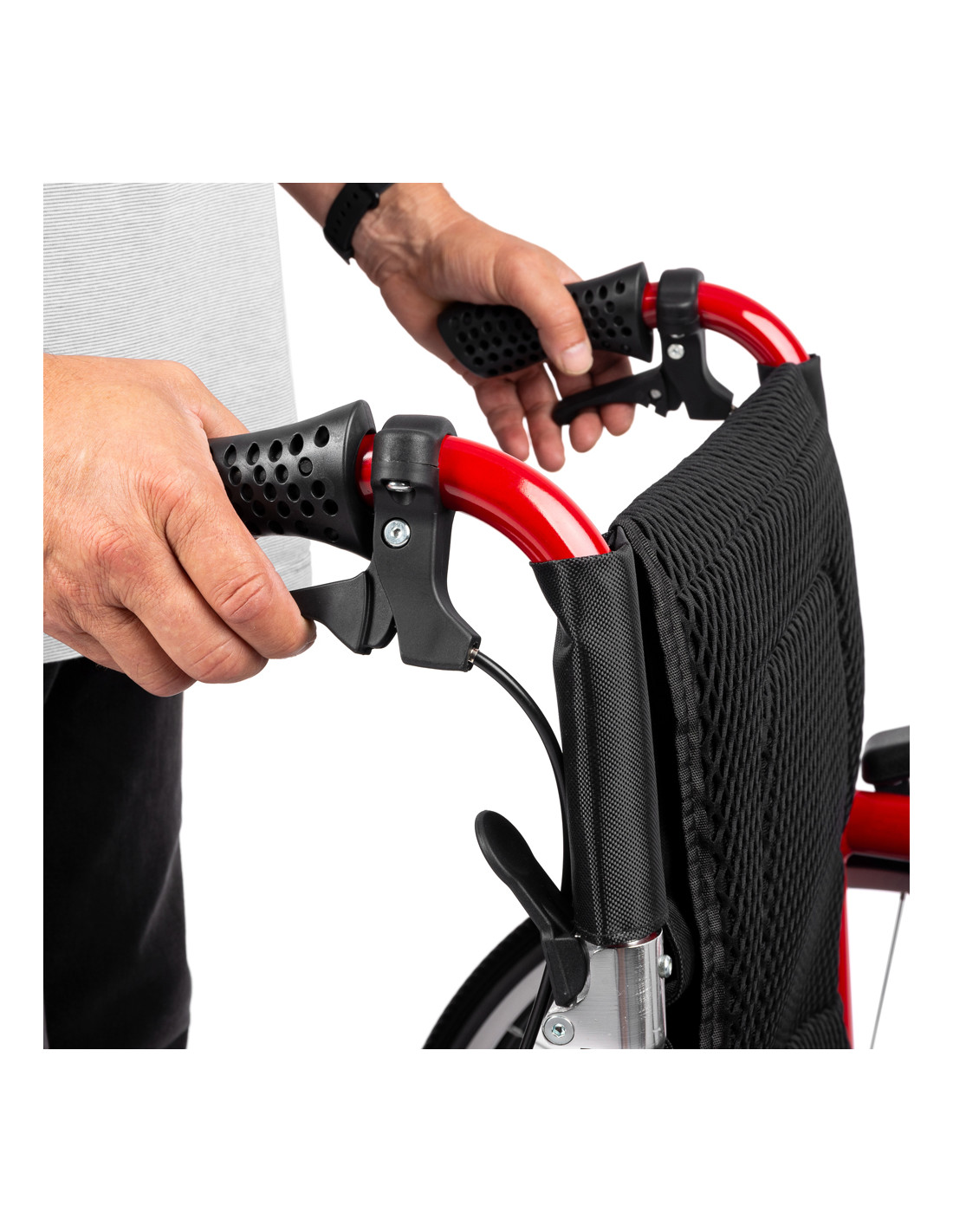 Exclusive-TIM to aluminiowy wózek inwalidzki klasy PREMIUM o nowoczesnym designie, w pięknym czerwonym kolorze ramy, który jest przeznaczony dla osób mających problemy z samodzielnym poruszaniem się.