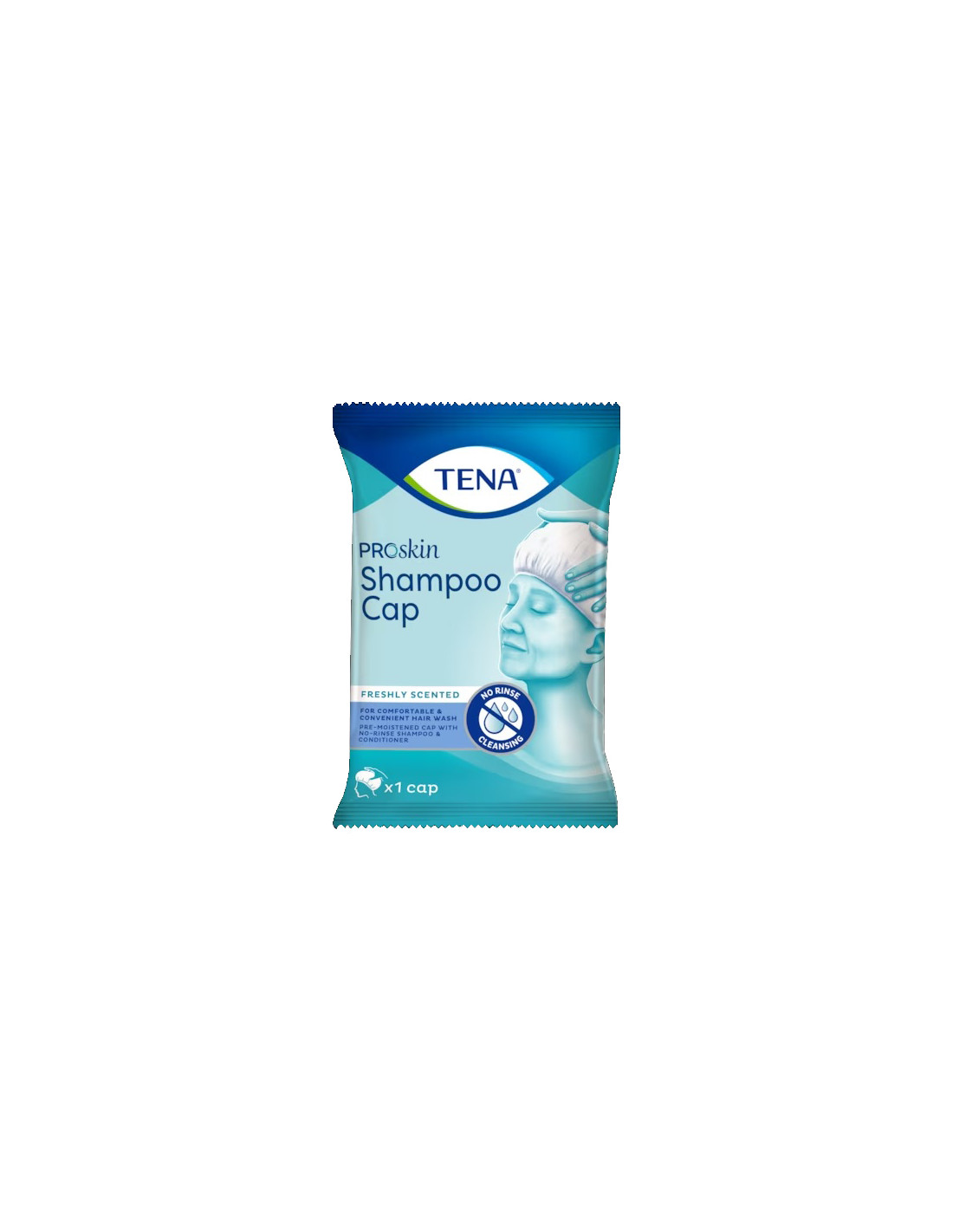 TENA ProSkin Shampoo Cap to czepek wstępnie nawilżony szamponem i odżywką o świeżym zapachu, umożliwiający wygodne mycie włosów w przypadkach, kiedy regularne branie prysznica lub kąpieli jest utrudnione.