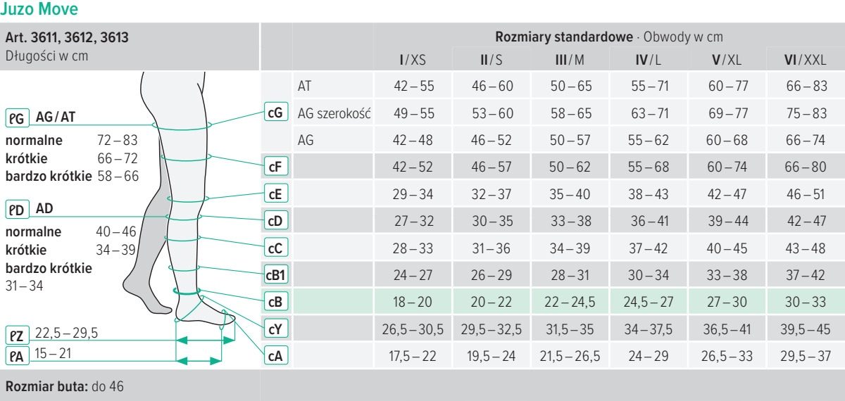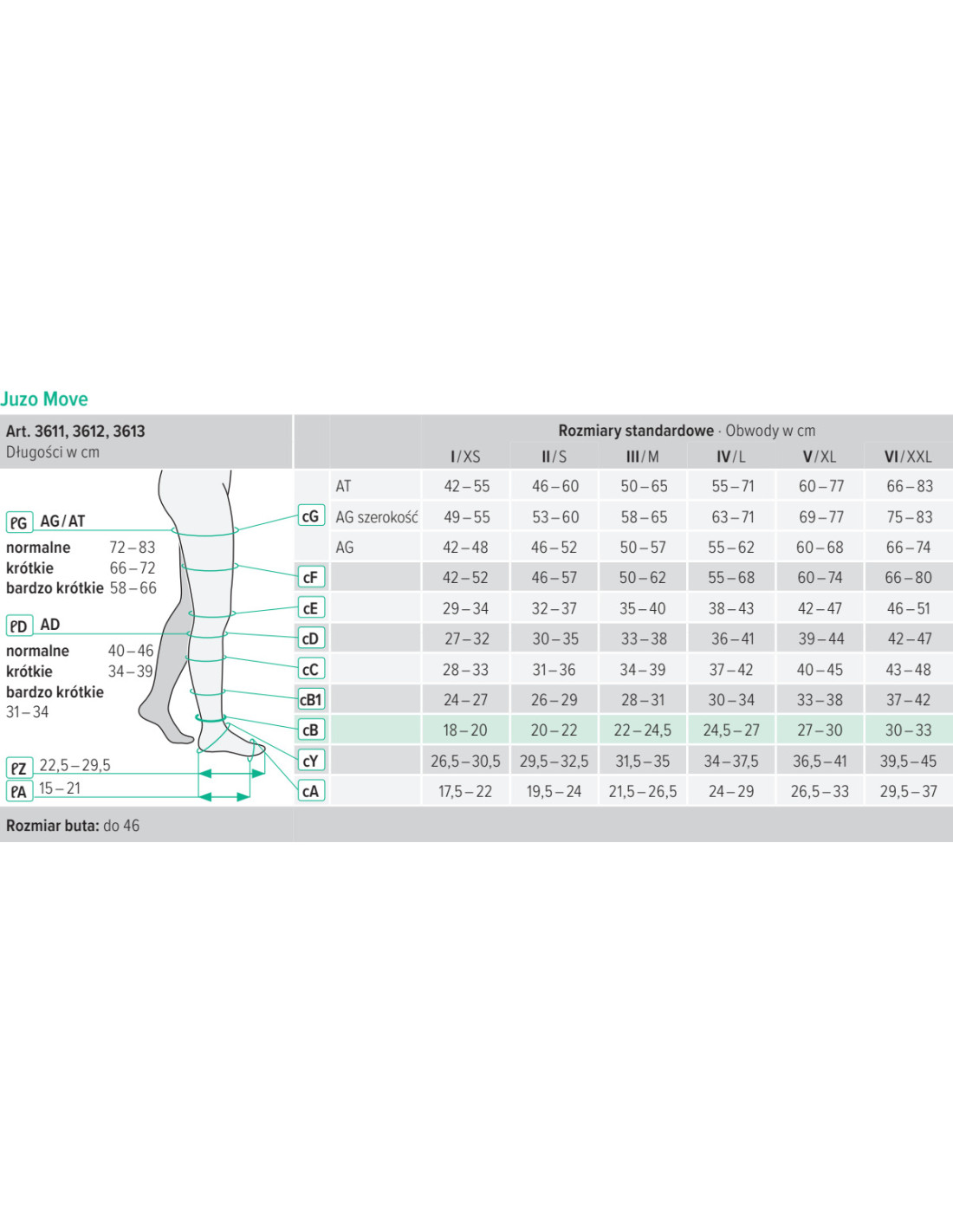 Rozmiary: I/XS, 2/S, 3/M, 4/L, 5/XL, 6/XXL – dobieramy po uprzednim porannym zmierzeniu obwodów i długości podudzi/nóg zgodnie z punktami zaznaczonymi w tabeli rozmiarowej. Pomiaru dokonujemy w pozycji stojącej bez obuwia.