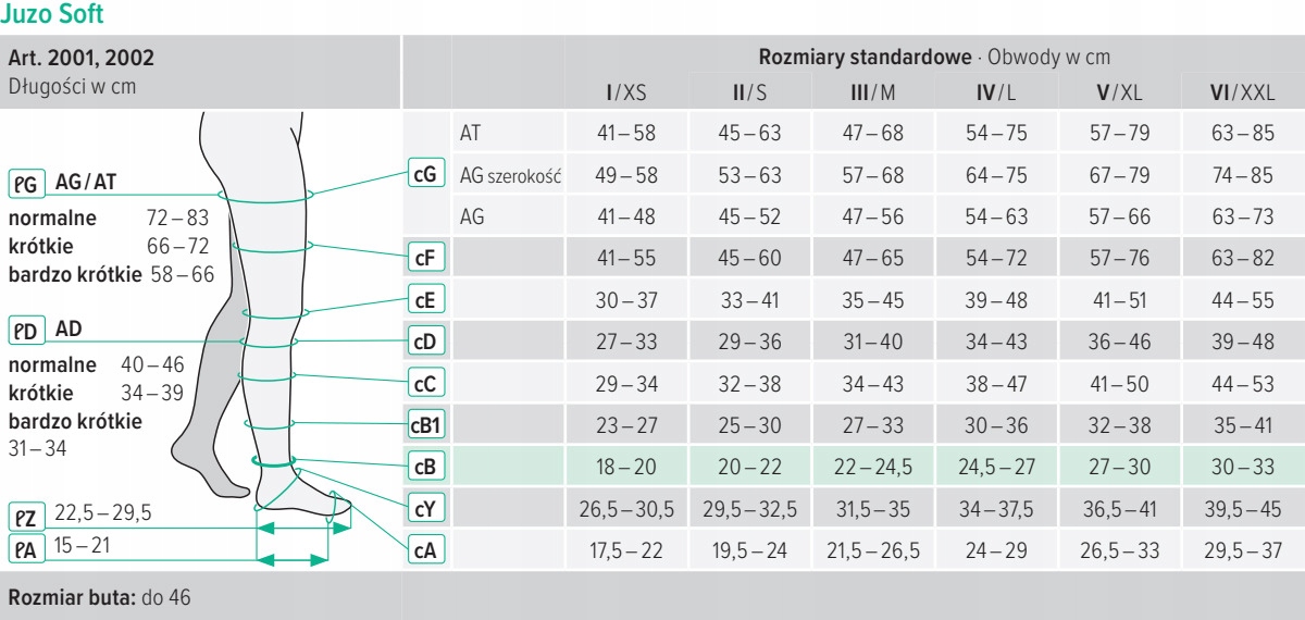 Rozmiary: I/XS, 2/S, 3/M, 4/L, 5/XL, 6/XXL – dobieramy po uprzednim porannym zmierzeniu obwodów i długości nóg zgodnie z punktami zaznaczonymi w tabeli rozmiarowej. Pomiaru dokonujemy w pozycji stojącej bez obuwia.